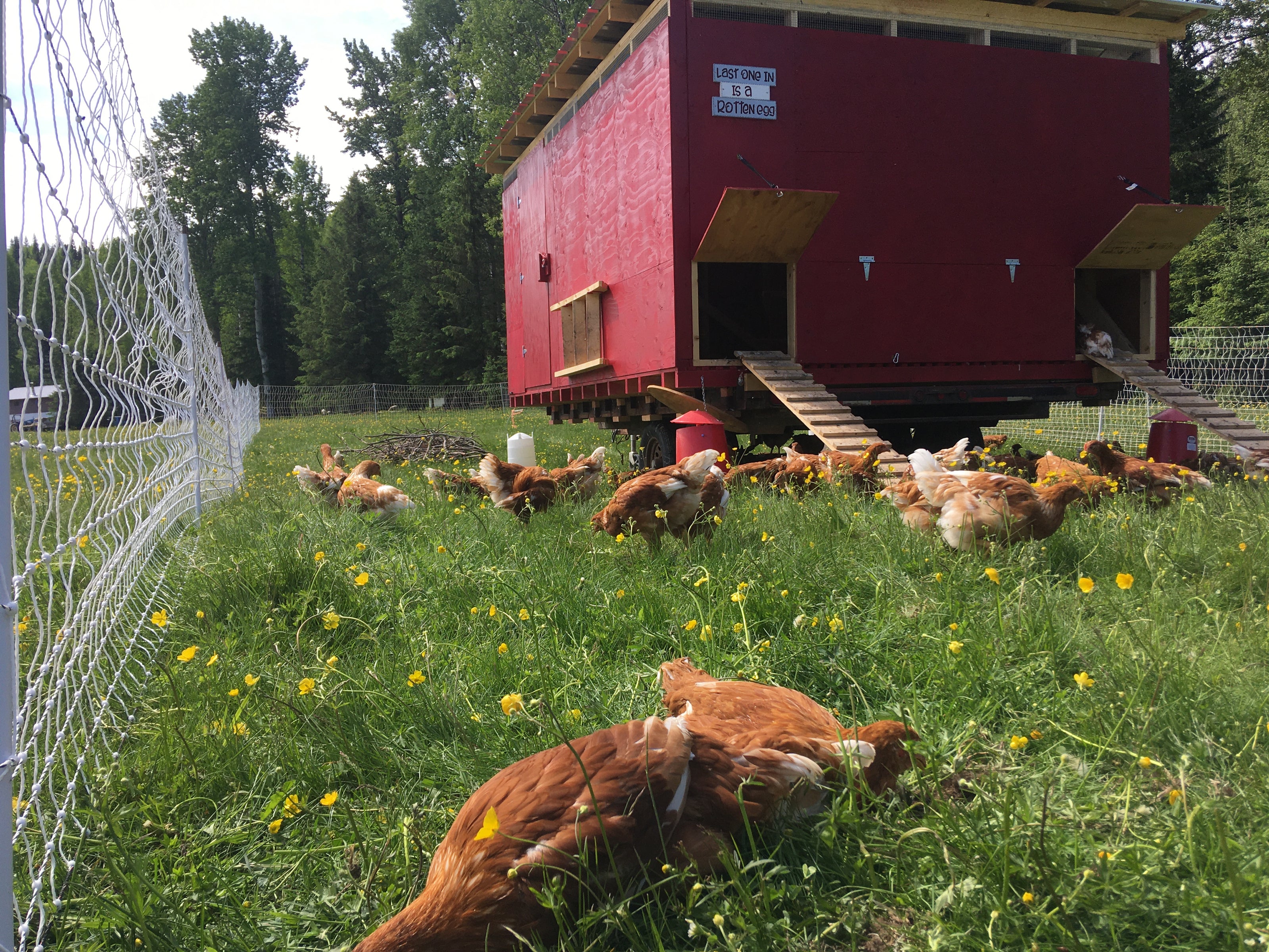We understand chickens love to forage and so we regularly move them and their mobile chicken coop to a fresh new patch of pasture. In return, these lovely brown and calm chickens help build our top soil.