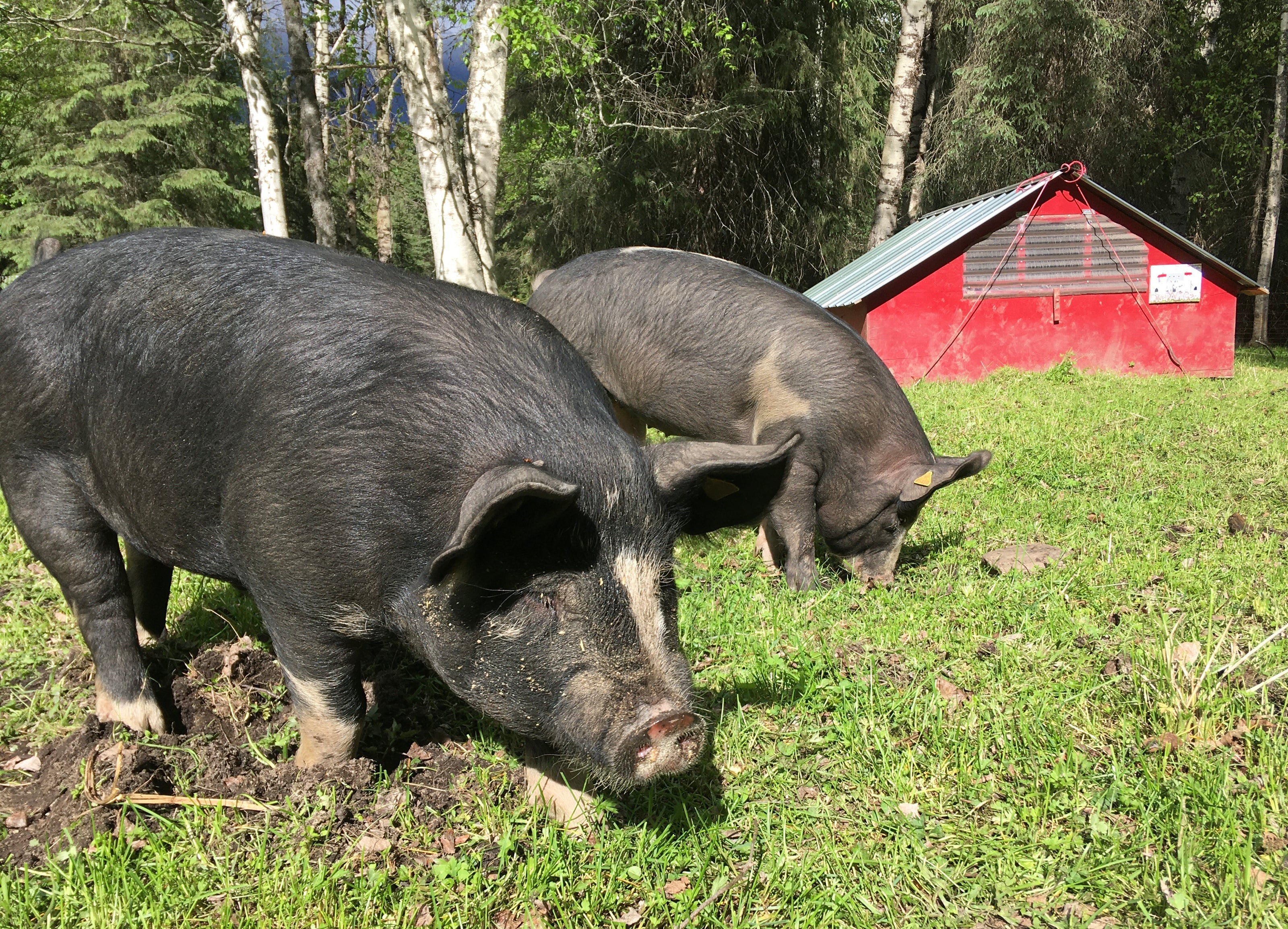 Our pigs are 3/4 Berkshire. Berks are hardy, well suited to pasture and our ancient Robson Valley forests; they turn out nicely marbled and flavourful meat.